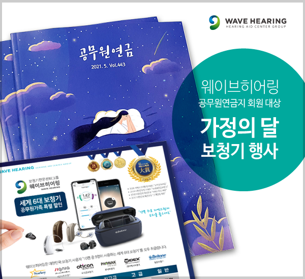 청각/보청기 전문가그룹 웨이브히어링은 세계 6대 보청기 브랜드(포낙/벨톤/스타키/오티콘/와이덱스/시그니아) 공급점으로 올해 공무원 연금지와 7년째 인연을 이어져오고 있다고 밝혔다. 이번 2021년을 맞이하여 공무원 은퇴 가족 대상으로 보청기 특별 할인 혜택을 제공해드린다고 전했다.