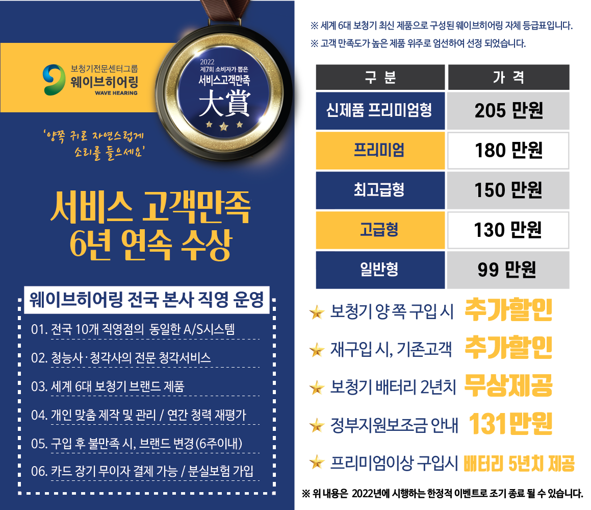 일반적으로 보청기를 구입하면 보청기 제품에 제공되는 무상수리보증기간은 2년이다. 보청기를 외이도(귓구멍)에 삽입하거나 귀에 걸게 되면 인체와 닿기 때문에 땀, 습기의 문제로 2년 시간 이후에는 수리가 필요한 경우가 잦을 수 있다. 종로 본점 송 원장은 이러한 부분을 고려하여 보청기 처음 착용하는 첫 구입고객에게는 ‘보청기 무상보증기간 6개월 연장 서비스’를 제공(앰프amp 제외)하고 보청기 재구입고객에게는 보청기 무상보증기간 이후 발생하는 리시버(REC) 혹은 마이크(MIC)에 대한 수리를 웨이브히어링이 대신 부담하는 ‘무상 수리 쿠폰’을 제공한다고 밝혔다.