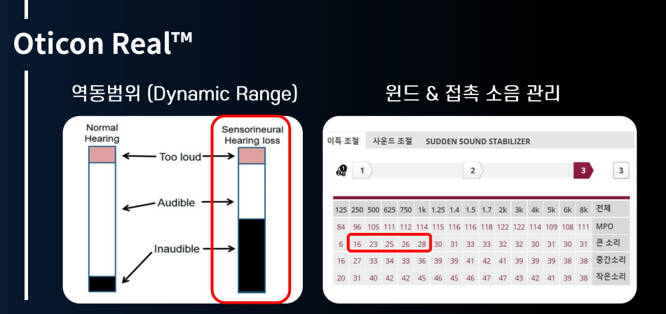 ※ 보청기를 사용하는 난청인 대부분은 감각신경성(감각성+신경성) 요소를 갖고 있습니다. 그러다 보니 좌측에 보시면 가청영역이 정상 건청인과 비교시 매우 좁아집니다. 저 영역안에 모든 소리를 넣어야 하기에 압축이라는 기술이 들어가고, 우측의 피팅 화면에서 바람소리/접촉 소리 등에 대한 피팅 적용은 큰소리 부분이 보강되어야 함을 설명하는 자료입니다.