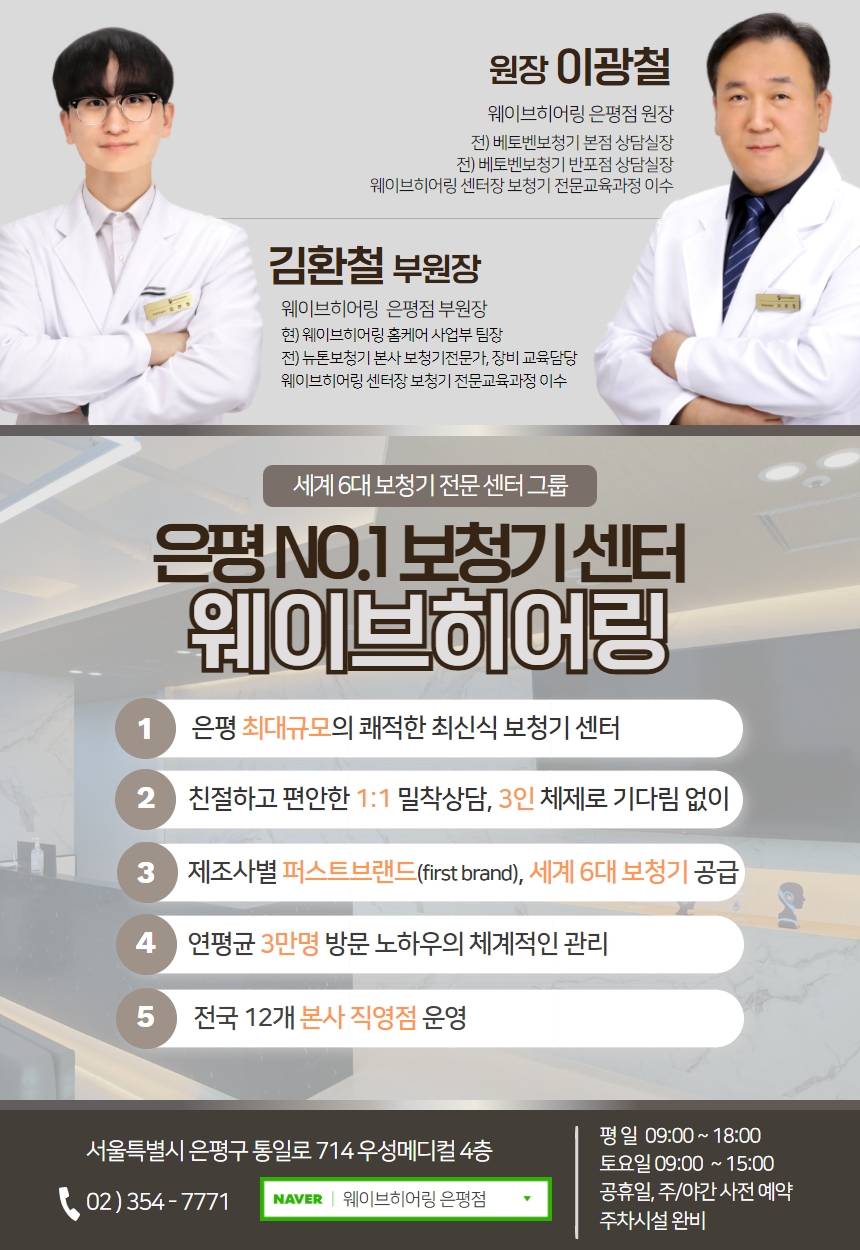 은평점은 전화예약은 물론 전화통화가 불편한 난청인들을 위해 네이버에 ‘웨이브히어링 은평점’ 검색 후 보청기 상담, 보청기 점검 등의 원하는 메뉴를 골라 손쉽게 예약할 수 있는 네이버 예약 서비스, 카카오톡 채널 추가 후 카카오톡 채팅을 통한 상담 서비스도 진행하고 있으니 많은 방문 바란다.” 고 덧붙였다.