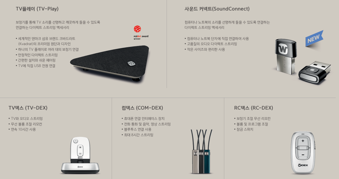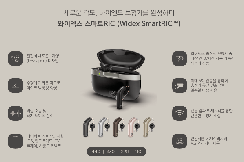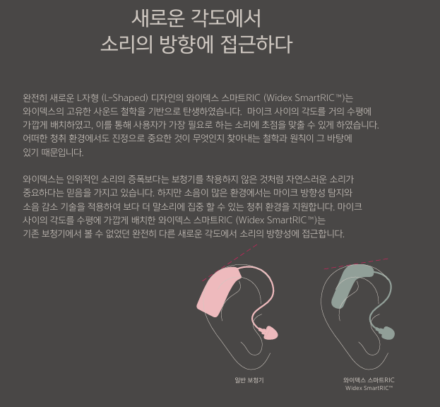 와이덱스보청기 "스마트RIC"는 보청기에서 스피커 역할을 하는 마이크를 최적화된 각도로 배치한 완전히 새로운 L자형(L-Shaped) 디자인을 적용했다. 세련된 디자인과 콤팩트한 크기의 제품으로 ‘2024 독일 디자인 어워드’ 본상(Winner)과 ‘2024 레드닷 디자인 어워드’ 의료기기&기술 및 헬스케어 2개 부문 본상을 잇달아 수상한 제품이다.