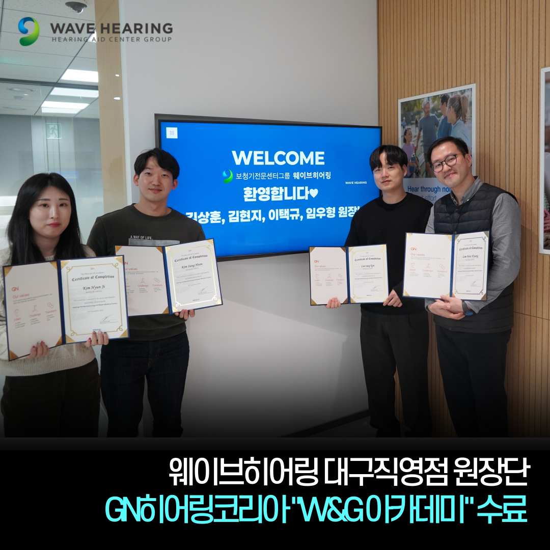 보청기 전문센터그룹 웨이브히어링 대구직영점 원장단이 GN히어링코리아(벨톤보청기)와 함께 보청기 실무교육 ‘W&G 아카데미’를 성공적으로 수료했다고 밝혔다.